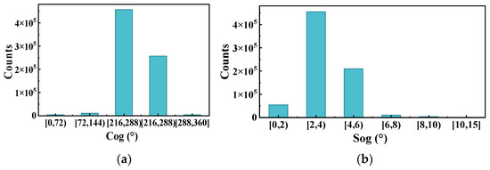 (4) Processing excessive acceleration: According to the Inland Waterway Navigation Standards, the acceleration distance Lm is 20 times the ship’s length in theoretical conditions, while the distance can be reduced to 10–14 times the ship’s length when the ship is empty. To prevent deleting correct AIS data, the acceleration distance Lm is set to be 10 times the ship’s length in the unloaded case in this paper. According to the equation of uniform acceleration motion, the maximum acceleration of the ship is calculated as follows:
