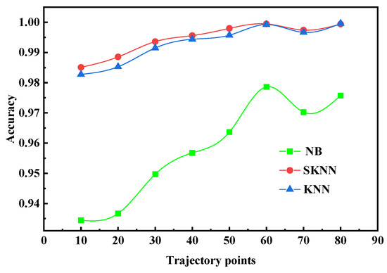 Figure 9 shows that the accuracy of the SKNN, the NB (Naive Bayesian algorithm), and the KNN gradually increase with increase in the sub-trajectory length. Under each sub-trajectory segment, the accuracy of the SKNN is the highest, the KNN is the second, and the NB is the worst, which indicates that the SKNN is effective.