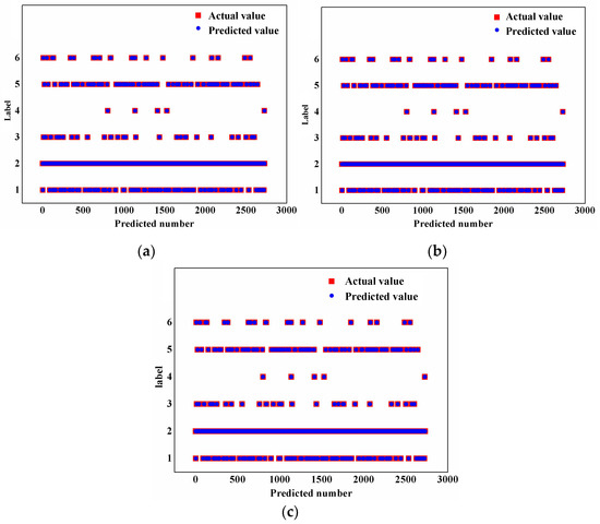 Comparison of accuracy from different algorithms. (a) Accuracy of NB = 0.9762; (b) accuracy of KNN = 0.9967; (c) accuracy of SKNN = 0.9996.