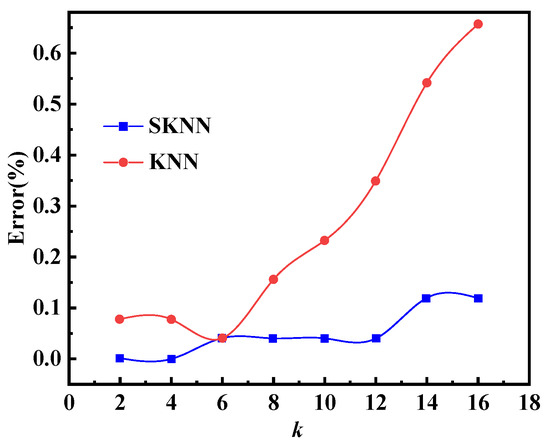 Figure 12 shows that the error of both SKNN and KNN gradually increases with increase in the training samples. The error of the SKNN algorithm is smaller than that of the KNN algorithm for different numbers of test samples, and the advantage becomes more obvious as the number of test samples increases. Due to its weighting mechanism, the SKNN can better adapt to this change and maintain a lower error rate. In contrast, the KNN is affected by noise and outliers when the data features change significantly, resulting in an increase in error due to treating all neighbors equally. Therefore, the SKNN is more stable and more accurate than the KNN algorithm with increase in the training sample proportion under the condition that the k-value is determined. The SKNN algorithm can maintain more than 99% accuracy when the percentage of test samples is below 40%.