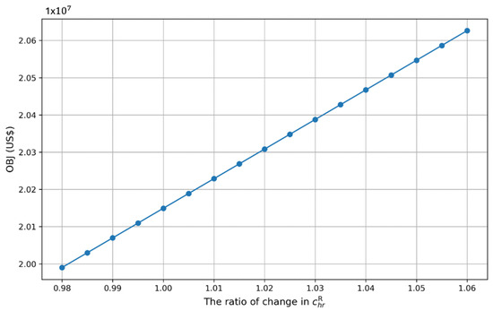 Finally, we examine the effect of ship repositioning costs () on operations management. To this end, different values are applied based on the repositioning time and tanker operating costs. According to data released in Ref. [38], from 2020 to 2021, operating costs for Small, Handys, Aframax, and Panamax tankers increased by 3% to 6%. Therefore, we set the value of to vary between 0.98 and 1.06 times its original value. As illustrated in Figure 1, where the x-axis shows the ratio of change in and the y-axis shows the total cost of the tanker shipping firm, i.e., OBJ (USD), we find that in this case, adjustments in repositioning cost linearly affect the total cost without altering other management decisions. The strict linearity observed in the relationship between the ratio of change in and the objective value in our study is because in our experimental setup, the change in the repositioning cost does not affect the values of other decision variables. Consequently, changes in the repositioning cost within this range only influence the total repositioning cost of the tanker shipping firm, resulting in a perfectly straight regression line across all points.