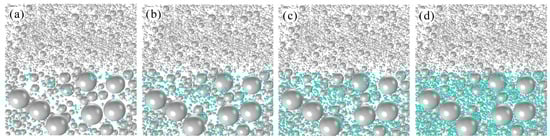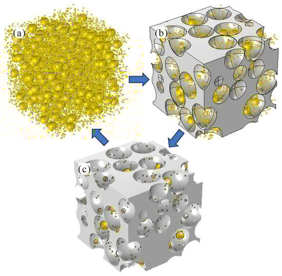 Naturally, hydrates occupy part of the reservoir pore space and participate in the forming of a solid skeleton. Morphologically, hydrates exhibit various pore habits and can either adhere to sediment particle surfaces (grain coating) or fill pore centers (pore filling). However, the sediment particles and hydrate particles are typically segregated in conventional DEM simulations, resulting in an exclusive pore habit of pore-filling [,,]. This strategy is convenient for saturation calculation, but the obtained model deviates significantly from the actual pore habits. The hydrate generation in this study employs a stochastic approach, enabling the hydrates to spatially coincide with the sediments. In this manner, the distribution of hydrate particles is more closely aligned with the actual situation. However, the direct calculation of hydrate saturation is not feasible when dealing with the overlapped particles, primarily due to the unknown overlap volume between hydrates and sediments. Technically, a Boolean operation is employed to crop hydrate particles from the primary pore models, thereby obtaining the actual occupied volume of hydrates (see Figure 1b,c). The process of hydrate formation is divided into multiple sequential steps to approximate the specified saturation. For a saturation Sh0, the expected volume of hydrate is