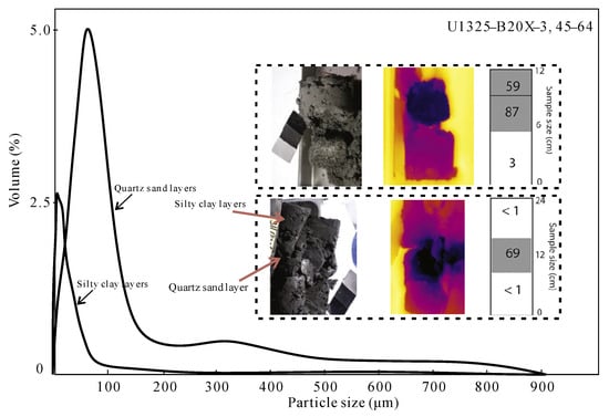 Naturally, the abrupt variation in particle size is the most prominent characteristic of marine turbidite sediments [,]. Due to the periodic occurrence of turbidity currents, the coarse-grained layers from turbidity currents are often interbedded with fine-grained hemipelagic and pelagic facies sediment layers [,,,,]. For example, the hydrate-bearing turbidite sediments in northern Cascadia exhibit a prominent feature of abundant sand layers, measuring several centimeters in thickness, which are interspersed among clay and silty layers []. The turbidite reservoir in the Eastern Nankai Trough Area comprises multiple sand layers, each approximately 1 cm thick []. Additionally, the hydrate reservoirs in Ulleung Basin (located on the east side of the Korean peninsula), Shenhu area (situated in the South China sea) and northern Gulf of Mexico exhibit analogous characteristics [,,]. The abrupt variation in particle size results in the formation of beddings [,], subsequently leading to the inherent permeability anisotropy []. It has been shown that the horizontal permeability can be twice as large as the vertical permeability for turbidite sediments []. Moreover, the occurrence of hydrates also has a particle size correlation []. According to the observation in the Integrated Ocean Drilling Program, the sand layers in drill cores demonstrate a significant cooling phenomenon; the reverse is the case in clay and silty layers, indicating that the coarse-grained layers have higher hydrate saturation [].
