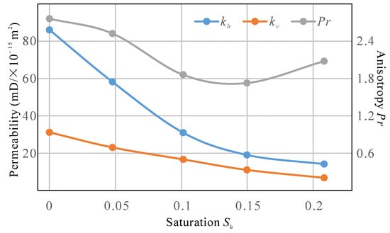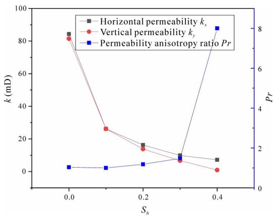 Within the saturation range from 0 to 0.15, the reduction in horizontal permeability is larger than that of vertical permeability, resulting in a decrease in anisotropy (Pr from 2.76 to 1.73). After reaching a saturation level of 0.2, the reduction in permeability decelerates and the anisotropy rebounds to 2.08. In general, the uniformly distributed hydrates may reduce the primary anisotropy induced by the bedding structure. With the saturation reduction in actual hydrate extraction engineering, the permeability anisotropy of the target reservoir may increase gradually.