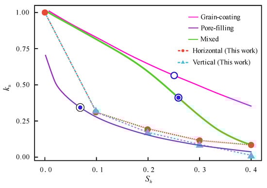 For comparison, the permeabilities under different saturations are normalized by the permeability when Sh = 0 (Figure 6). The analytical solutions for permeability–saturation relationships in the presence of grain coating (where hydrate preferentially exists on particle surfaces) and pore filling (where hydrate preferentially exists within pore spaces) hydrates in a parallel cylindrical capillary are theoretically derived []: