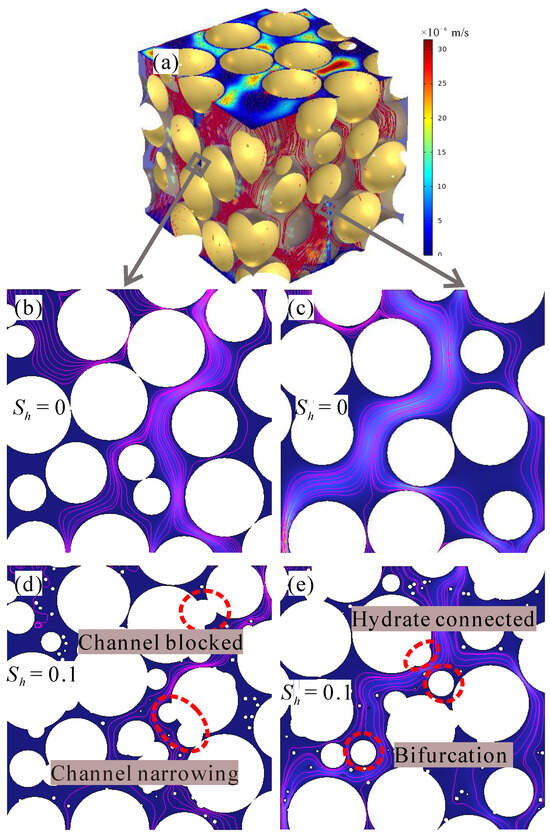 With increasing hydrate saturation, the pore space is occupied with hydrates and the fluid transport is restricted. Conceptually, hydrates with overlap are considered to be grain-coating mode while hydrates without overlap are considered to be pore-filling mode (Figure 7). The presence of pore-filling hydrates significantly disrupts the flow field, resulting in the bifurcation of seepage channels and leading to a substantial decrease in channel velocity across several orders of magnitude. The grain-coating hydrates, in contrast, only result in the narrowing of flow channels, and the decrease in flow rate is not as significant as that caused by pore-filling hydrates (Figure 7d,e). Moreover, with the increasing in hydrate saturation, hydrates with different pore habits will be connected to each other, thereby forming cluster and patchy hydrates and locking the seepage channels completely. At high saturation conditions (Sh ≥ 0.3), more than 70% seepage channels are effectively blocked, leading to great heterogeneity of the pore model and further causing the generation and enhancement of anisotropy. It has been proved that the inhomogeneous distribution of hydrates would cause secondary anisotropy of the pore system []. However, in this research, the uniformly distributed hydrates also cause permeability anisotropy in relatively high saturation ranges (Sh ≥ 0.3). It is considered that the model size limits the representativeness of simulation results within a relatively high saturation range. Only a few seepage channels remain connected in the model in this situation, necessitating an increase in the REV size. Therefore, the confirmation of the increase in anisotropy needs to be further substantiated by considering the scale effect. In general, the scale effect only disturbs the simulation results within a relatively high saturation range. Within this saturation range, the permeability decreases by several orders of magnitude and the disturbance of scale effect is insignificant to the overall evolution of permeability (Figure 6). Therefore, while the accidental increase in anisotropy may be subject to debate, the permeability evolution derived from simulation results remains reliable.