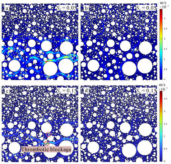 Effect of uniformly distributed hydrates on flow field: (a) Sh = 0.05, horizontal flow; (b) Sh = 0.05, vertical flow; (c) Sh = 0.15, horizontal flow; and (d) Sh = 0.15, vertical flow.