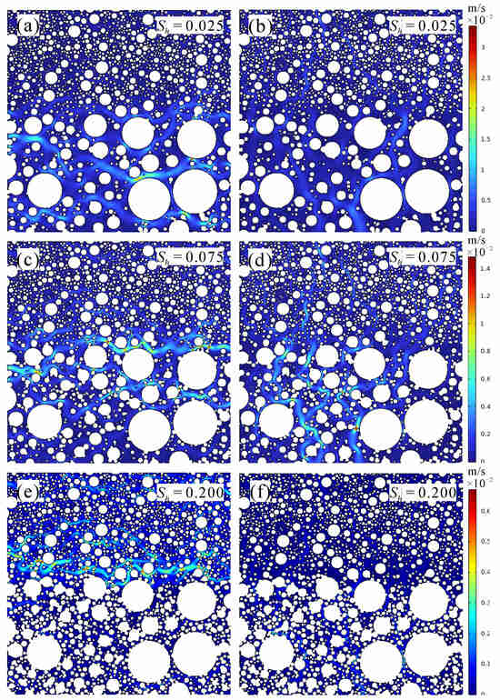 Effect of preferentially distributed hydrates on flow field: (a) Sh = 0.025, horizontal flow; (b) Sh = 0.025, vertical flow; (c) Sh = 0.075, horizontal flow; (d) Sh = 0.075, vertical flow; (e) Sh = 0.200, horizontal flow; and (f) Sh = 0.200, vertical flow.