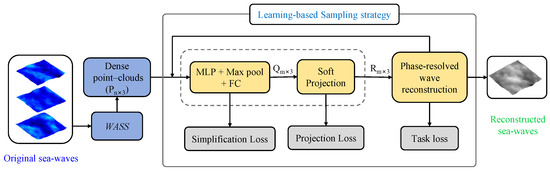 To enhance the accuracy of real-time wave field reconstruction based on remote optical measurements, in this study, we developed a learning-based downsampling network. We defined a total loss function that considers task loss and sampling loss as the optimization objective to obtain the optimal input point cloud for downstream reconstruction tasks. The downsampling network comprises a point cloud simplification network and a soft projection operation, enabling sampling at any predetermined ratio. The resulting point cloud satisfies task optimality, similarity to the original point cloud, and distribution uniformity at the specified sampling ratio. The overall optimization framework for the task is illustrated in Figure 1. The dense wave point cloud is obtained by initializing the input wave stereo image pairs through the WASS pipeline [51], which contains 3D position information of n wave observation points, and is used as input data for the network. The data volume of is compressed to m by the simplified network to form a point cloud with a smaller data volume, and the sampled output point cloud is obtained by soft-projecting onto . This step is used to further ensure the proximity between the simplified point cloud Q and the original point cloud P. This output serves as an input to the wave reconstruction algorithm for the downstream task. The sampling network is trained to obtain the optimal sampling strategy by minimizing the task loss based on the phase-resolved wave reconstruction. After converging, reconstructed sea-waves are exported. Next, we introduce the construction of learning-based sampling network and the algorithm of phase-resolved wave reconstruction.