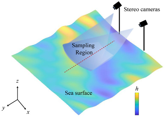 In this work, the origin point cloud is measured by stereo cameras installed on the ship. To illustrate this process and verify the effectiveness of our framework, we first construct a data set from the numerical sea wave based on the LWT model. Figure 3 shows the sampling process by stereo cameras, which face downward at an angle of 45° along the negative direction of the z-axis. The horizontal aperture angle of the cameras is 70° and the vertical aperture angle is 55°. The stereo camera captures 32,468 pixel pairs in the viewing range. Three-dimensional coordinates of the point cloud are intersection points between the rays and waves’ surface.