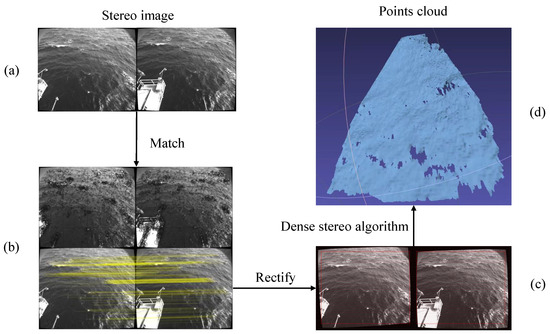Point cloud construction by WASS. (a) is a stereo image. (b) shows the sea wave after matching. (c) is the rectification process. (d) is the reconstructed wave point cloud.