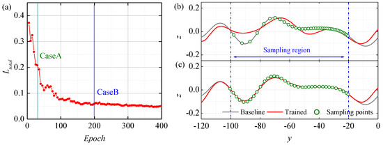 Figure 5a displays the evolution of total loss during the training. converges with an approximately exponential decay trend as the number of training epochs increases. After 200 training epochs, the losses approximately converge. Total loss decreased from an initial value of 0.37 to 0.05 at , which improves the performance of the downstream reconstruction task by 32%. To illustrate the sampling results and reconstruction effects of the network, we select two snapshots during training, that is CaseA () and CaseB () in Figure 5a. We present the one-dimensional wave cross-section form to (red line shown in Figure 3).