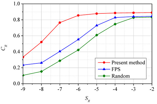 where is the number of total sampling point from WASS, and is the number we used. We introduce two other methods as a comparison, the FPS method and random sampling algorithms, to evaluate the performance of the present method. As shown in Figure 8, increases with the increases in for all three methods, and the sampling network keeps the leading position followed by the FPS method. For low sampling ratios , FPS and random sampling algorithms have poorer reconstruction results (). However, our sampling network shows excellent ability in these ranges; for example, the completeness ratio can reaches 0.78 more than compared the FPS method () at −7. When −6, our method can reach , which leads the reconstruction task performance by more than compared other two methods. In the higher sampling interval , the performance gap between the three methods narrows. However, our method maintains a slight lead throughout the interval, consistently achieving a 1–2% higher than the traditional methods. This highlights the superior performance of the algorithm in various sampling density scenarios for the downstream reconstruction task.