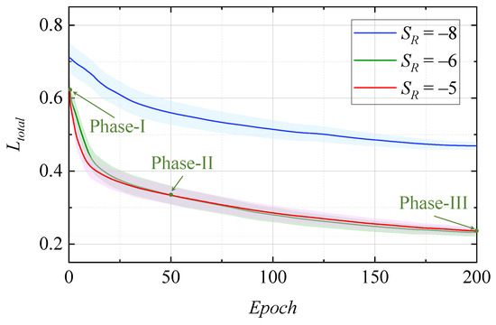 Total loss varies with the training epochs for sampling ratios − −6 and −5. Lines represent the average value and shadow region regions are deviation. Phase-I to -III are three phases during training for −6 case.