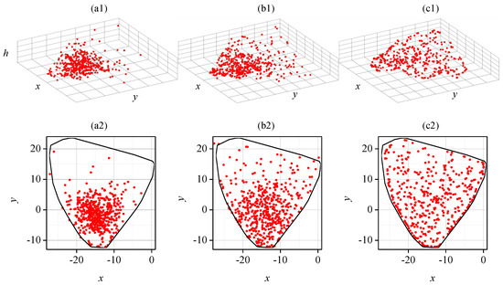 Figure 9 illustrates the spatial distribution of sampling points from the global views (the first row) and the horizontal projections (the second row). To better present the distribution of the point cloud during the training process, we chose one point for every five neighboring points to show the distribution. The distribution of sampling points during the pre-training phase (Phase-I in Figure 9) is notably uneven, as shown in Figure 10a1,a2. Most sampling points are concentrated in the central region of the observation frame and in proximity to the observation viewpoint. Conversely, sampling points are relatively sparse in the peripheral regions, away from the viewpoint along the frame’s edges. This inhomogeneous distribution arises from inherent variations in the density of the original point cloud data across different regions. Figure 10b1,b2. depicts the distribution of sampling points during Phase-II. Compared to Phase-I, the sampled points exhibit a more uniform distribution throughout the observation area, with a reduction in the density of the central region and an increase in the number of points in the edge regions, albeit with some residual sparse areas. Figure 10c1,c2. presents the final distribution of sampling points in the post-training stage (Phase-III). Following comprehensive network optimization, the sampling points demonstrate a uniform and random distribution in three-dimensional space, no longer exhibiting excessive concentration in specific regions. Both central and peripheral areas exhibit balanced densities without any conspicuous blank or overdense regions. The adaptive sampling algorithm’s gradual optimization of the sampling strategy during the training process transforms the initially uneven distribution, influenced by the observation viewpoint, into a final optimized sampling distribution that uniformly and efficiently covers the entire area.