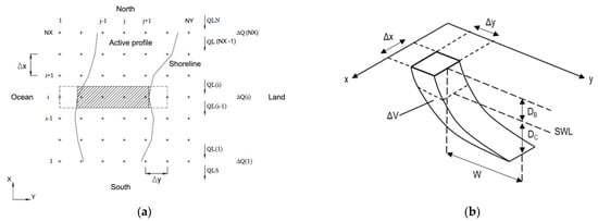 LTC (Long-Term Configuration) is a shoreline evolution numerical model designed for sandy beaches [34]. Figure 1 presents the main features of the model, which considers a numerical domain defining the bathymetry and topography of the coastal system through a grid of points (NX—number of points alongshore and NY—number of points across-shore). The points are spaced Δx in the longshore direction, and Δy in the cross-shore direction.