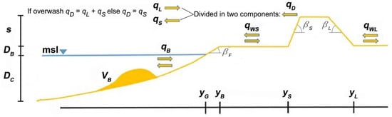 For each time step, the model computes the different components of cross-shore sediment transport, and these volumes of sediment are geometrically prescribed, updating the scheme of the cross-shore profile. In the CS-Model, the evolution of the berm position is given by Equation 4 and depends on the sediment exchanges between the submerged sandbar and the berm of the beach (qB), the effect of wind-driven transport (qWS), and the component of seaward dune erosion due to wave impact (qS). According to Larson et al. [25], if overwash does not occur, the total volume eroded from the dune face (qS) is totally transferred to the beach berm (qS = qD).
