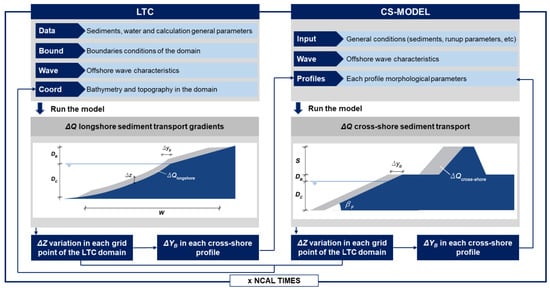 Sediment transport at a point in the nearshore zone is a vector with both longshore and cross-shore components [39]. In accordance with USACE—United States Army Corps of Engineers [39], at each time step, both LTC and the CS-Model (for each of the NX profiles) are run, and the sediment transport volumes computed by each model and for each cross-shore profile are integrated according to the following sequence (Figure 3):