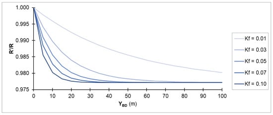 According to Equations (5)–(7), the CS-Model estimates dune erosion in relation to the geometric characteristics of the profile, namely the berm height and the beach width. It is observed that the adjusted runup height (R′) diminishes as the beach width increases, converging towards the berm height of the beach profile. Under the assumption of a constant initial berm height, this convergence is more rapid for narrower beaches when the friction coefficient () is higher. As an illustrative example, considering a constant wave climate characterized by H0 = 3 m and T = 10.55 s, and a beach profile with the berm height and the dune toe at 2.8 m, Figure 4 presents the evolution of the adjusted runup height as a function of the beach width, for different values of friction coefficient ( ranging from 0.01 to 0.1).