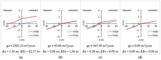 Impact of sand transfer from dune face to berm in the bathymetry and topography, and consequent shoreline position, for different combinations of initial beach width and friction coefficients: (a) YBD = 15 m; = 0.01; (b) YBD = 15 m; = 0.05; (c) YBD = 50 m; = 0.01; (d) YBD = 50 m; = 0.05.