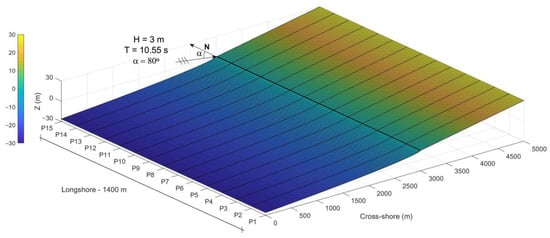 The numerical study was conducted using a mesh composed of 15 profiles spaced 100 m in the longshore direction and 251 points in the cross-shore direction, spaced 20 m (5000 × 1400 m2) apart. The initial shoreline position was defined with a rectilinear configuration (Figure 7).