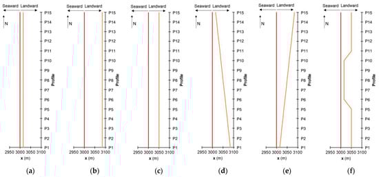 Assessed scenarios (berm position, YB—red line; seaward dune foot position, YS—orange line): (a) Scenario S1; (b) Scenario S2; (c) Scenario S3; (d) Scenario S4; (e) Scenario S5; (f) Scenario S6.
