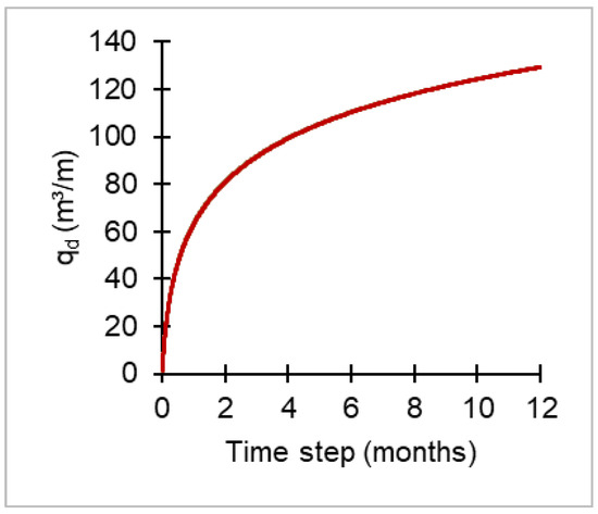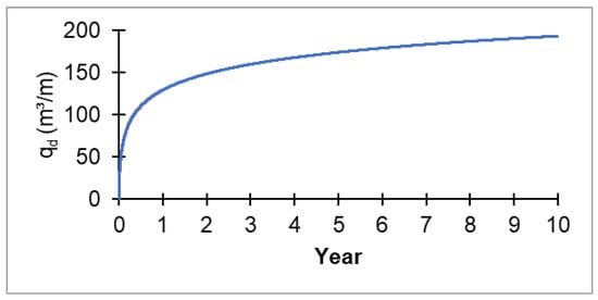 The numerical simulations presented in this research were developed considering a medium-term perspective (1-year period), but coastal management requires long-term projections. To discuss the importance of beach–dune interactions from a long-term perspective, the scenario of alongshore beach width equal to 15 m was assessed over a 10-year period. The results suggest that the sediment transport from the dune face is more intense in the first year of the numerical simulation (two thirds of the total transported volumes from the dune to the domain), and the beach–dune system tends towards equilibrium, with a decrease in the volume eroded from the dune over time (Figure 15), which justifies the time span adopted in the presented simulations. At the end of the numerical simulation, the beach width of the beach profiles was close to 49.50 m. Thus, increases in beach width due to gains induced by cross-shore transport from the dune lead to a decrease in runup height over time, consequently making the dune less vulnerable to wave impact.