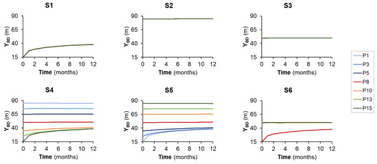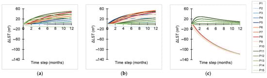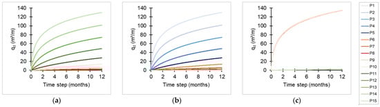 In scenario S6, the longshore sediment transport leads to a beach width gain in the profiles with an initial beach width of 15 m (P6 to P10). In this scenario, these profiles exhibit a beach berm gain of approximately 22.7 m at the end of the simulation (final width of about 37.7 m), falling below the gain observed in scenario S1, where only cross-shore sediment transport processes impacted the shoreline evolution. In fact, when the values of both components of sediment transport are compared, it is observed that longshore processes have a negative impact (loss of volume), in spite of being lower than the gain of sediment volume in the profiles, due to the cross-shore component of sediment transport (Figure 10c and Figure 11c).