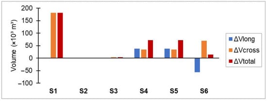 In scenarios S4, S5 and S6, it was observed that both longshore and cross-shore sediment-transport-processes occur in the beach profiles. Figure 10 and Figure 11 present the cumulative sediment transport in each beach profile of the numerical domain, due to cross-shore and longshore effects, respectively.