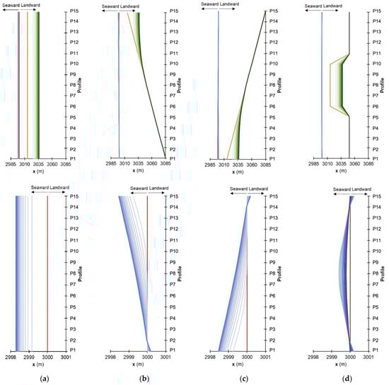Table 2 presents the values adopted for the main variables involved in the CS-Model simulation of the cross-shore processes within the beach profiles that are common to all profiles of the study area. In the context of the problem addressed in this article, and as mentioned previously, the parameter related to wind-blown sand transport was set to zero, and the initial sandbar volume of the beach profiles was calculated and defined to be in equilibrium with the wave climate. Thus, there were no sediment exchanges within the beach profiles related to wind transport, or between the berm and the submerged sandbar. The configuration of beach profiles was defined to ensure that the dune maintained its trapezoidal shape during the numerical simulation. The dune height (S) was defined as sufficiently high to prevent overwash events, and the profile’s berm height (DB) was set at 2.8 m. Based on the previous analysis, and as already mentioned, the parameter was defined as 0.05, and CS was set to 0.1. The water level was kept constant throughout the numerical simulations (Δh = 0 m).