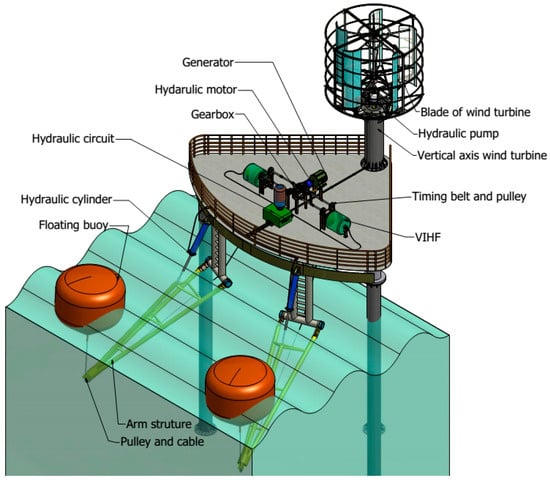 - A novel conceptual design for a hybrid nearshore wind–wave energy converter system, integrating a high-efficiency wave energy converter with vertical axis wind turbines.
