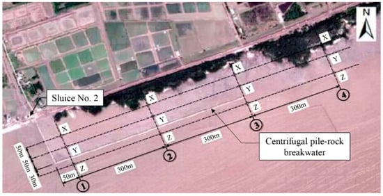 The breakwaters were placed at localities subjected to extreme erosion (Figure 3). To determine the effect of creating alluvial ground of the breakwater at Location B with pile–rock breakwaters at Vinh Chau, Soc Trang, the author measured the elevation of 4 cross-sections perpendicular to the breakwater, as shown in Figure 4.