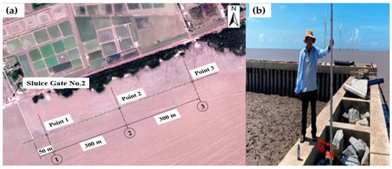 Settlement observations were carried out on two components of the pile–rock breakwater at Location B: (1) the concrete part on the top of the breakwater, and (2) the rock layer located between the concrete and the pile. The monitoring points were marked on the breakwater at the interval of 300 m along the breakwater route; they are shown on the ground in Figure 5. Because the surface of the rock was not flat, we undertook a fixed measurement at a distance of about 50 cm from the observation point of the concrete settlement. The observation period started on 14 October 2021 and ended on 17 July 2022.