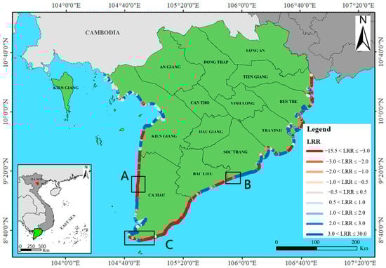 In this study, shoreline sections were segmented at a distance of 50 m from Tien Giang to Kien Giang to measure the shoreline position and calculate shoreline change rate, as outlined. The shoreline position in 2000 was chosen as the baseline when calculating the shoreline change rate. The value of the LRR can be negative or positive, where a positive value represents movement away from shore (deposition) and a negative value represents movement towards land (erosion). Based on the geomorphological characteristics and the rate of change of the shoreline, statistics in the study area combined with the results of the research groups [], the average displacement rate calculated based on the LRR method was divided into 9 ranges of values based on 3 main characteristics: erosion, stability, and deposition. Each range corresponds to a hierarchy of the erosion status of the area. In particular, the erosion phenomenon was divided into 4 more detailed value ranges, including extremely high, high, medium, and low erosion. At the same time, the deposition phenomenon was also divided into 4 ranges including low, medium, high, and extremely high deposition zone.