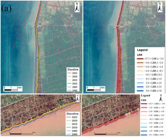 The assessment of shoreline change rates stands as a prevalent indicator in coastal studies, denoting alterations in the shoreline position perpendicular to a designated cross-section over time [,]. This transformation can manifest as either long term, spanning decades or centuries, or short term, reflecting seasonal or even more rapid changes in shoreline position. Linear regression (LRR) represents a widely adopted method for quantifying shoreline change rates [].