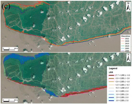 Shoreline changes in the period from 2000 to 2022: (a) Location A, (b) Location B, and (c) Location C.