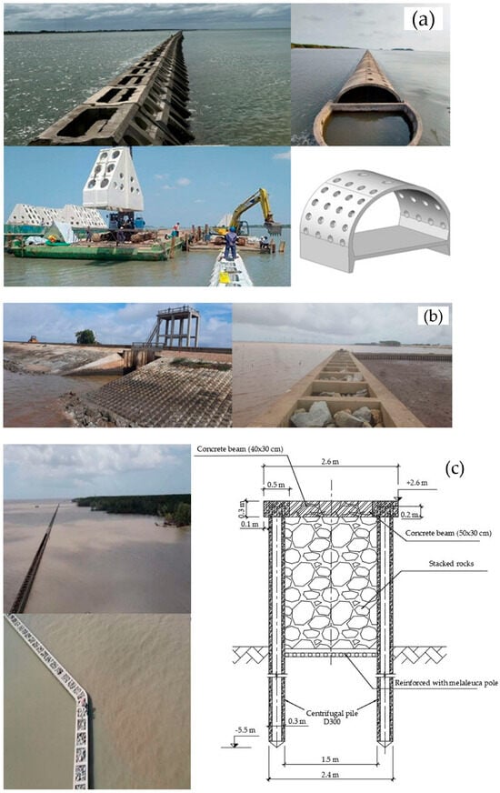 Coastal protection structures in VMD: (a) Busadco and semi-circular breakwaters in Tran Van Thoi, Ca Mau; (b) revetment and centrifugal pile–rock breakwater in Vinh Chau, Soc Trang; (c) centrifugal pile–rock breakwater and mangrove belt in Ngoc Hien, Ca Mau.