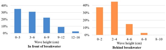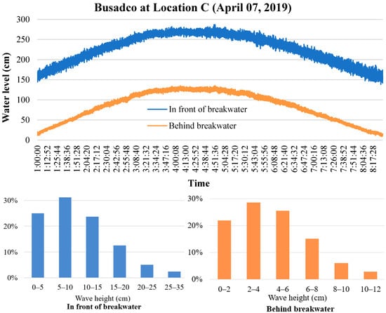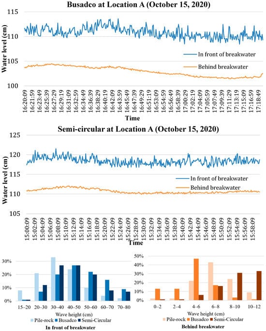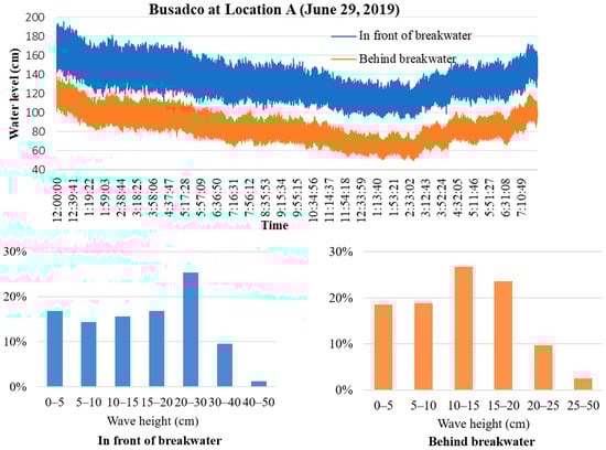 Location A, on the west coast of the VMD, experiences the full impact of the southwest monsoon, prevailing during the rainy season from May to November each year. To assess the wave dynamics in this region, the research team conducted wave height measurements both in front of and behind the Busadco breakwater on 29 June 2019. Subsequently, the team extended these measurements to encompass three different types of breakwaters in this location (pile–rock, Busadco, and semi-circular breakwaters) on 15 October 2020. The outcomes of the wave composition before and after the implementation of these three types of breakwaters are illustrated in Figure 9 and Figure 10.