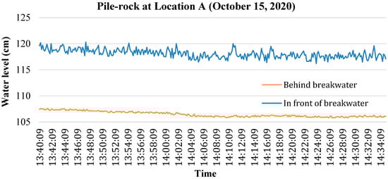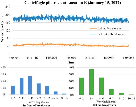 Water level and wave height component at the centrifugal pile–rock breakwater at Location B (15 January 2022).