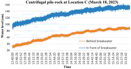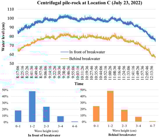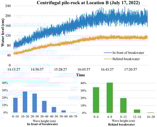 Water level and wave height component at the centrifugal pile–rock breakwater at Location B (17 July 2022).