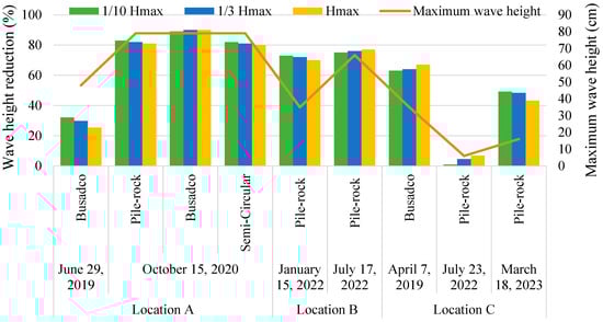 Considering cases for calculating wave reduction based on actual measurement results for three cases: (a) average 1/10 of the maximum wave height (1/10 Hmax); (b) average 1/3 of the maximum wave height (1/3 Hmax); and (c) average wave height (Hmax).