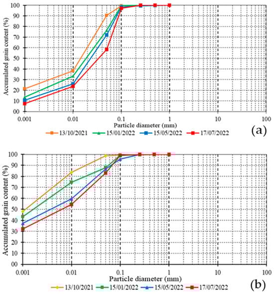 The results of monitoring the settlement of the rock in the middle of the concrete components of the breakwaters are shown in Figure 20b, showing that the largest settlement was −290 mm at point 3 after more than nine months of monitoring. Compared to the concrete components, the settlement of the rock pit was relatively large. The settlement of the pit rock is the sum of (1) the settlement of the soil layer below and (2) the settlement related to the rearrangement of the rocks. The results of calculating the settlement of the soil according to the Vietnamese foundation design standard (TCVN 10304:2012) show that the settlement of the soil was up to −416 mm. Combined with the decrease in the settlement rate of the rock elements, it can be seen that the consolidation settlement is nearly complete.