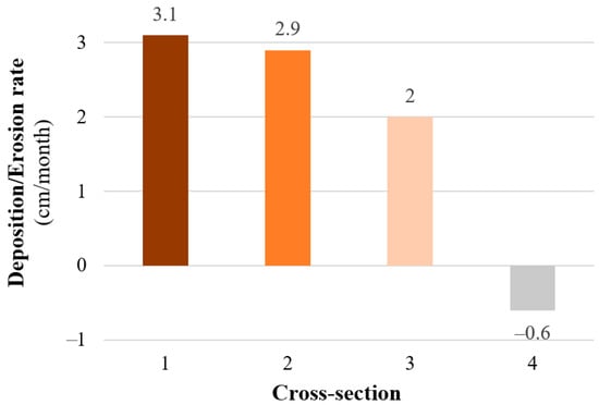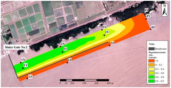 The shoreline to the south of this area exhibited a higher rate of erosion (up to 15.5 m/year) than the north, where there are alternating sections of erosion and deposition (Figure 7b). Locations B and C were influenced by the semi-diurnal tide regime of the East Sea when the high and low tide repeats two cycles in a day combined with strong northeast monsoons in the months from October to March [], which led to extremely forceful coastal erosion.