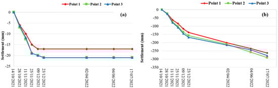 Settlement of pile–rock breakwater: (a) settlement of concrete components and (b) settlement of rock components.