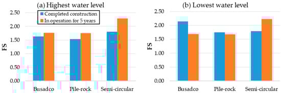 The stability calculation results shown in Figure 21a, considering the scenario with the highest sea level, demonstrate increased stability coefficients for all types of embankments after 5 years of operation. Conversely, in the case of the lowest sea level (Figure 21b), it is noted that the stability coefficients for the Busadco embankment and the eccentric embankment decline over time. Particularly, the Busadco embankment experienced a reduction from 2.14 to 1.68. Meanwhile, the stability coefficients for the hollow cylindrical embankment were augmented, akin to Figure 21a. This can be explained by the geometric structure of the crescent embankment, which redirects external forces toward the embankment’s center. In contrast, the triangular hollow structure of the Busadco embankment, which is subject to pressure from one side along with vortex holes at the embankment’s base, exhibits a heightened susceptibility to instability.