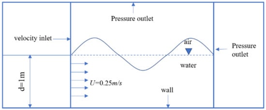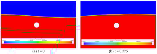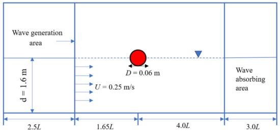 Referring to the physical experimental values of Bai et al. [6], the wave current force acting on a semi-submerged horizontal cylinder was verified. As shown in Figure 4, a horizontal cylinder with a diameter of D = 0.06 m, a depth of d = 1.6 m, a flow velocity of c = 0.2 m/s, an incident wave period of T = 0.7 s, and a wave height of H = 0.03 m was partially submerged in water.