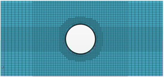 The horizontal position and grid of the cylinder, as per the numerical calculations, are shown in Figure 1 and Figure 2. The ratio of the distance from the center of the cylinder to the static water surface to the diameter of the cylinder is S/D = −5~0; the water depth is d = 1 m; the radius of the cylinder is R = 0.035 m~0.065 m; and the damping ratio is 0.02, which remains unchanged. Multiple flow velocities are selected, Ur = 1.445~3.372. In numerical calculations, the grid division is set to perform multi-layer refinement near the free surface, and 200 grids are divided around the cylinder. The thickness of the boundary layer closest to the cylinder is D/1000 m. For the convenience of subsequent analysis, the fluid loads in this paper are all dimensionless and are treated using empirical formulas that do not consider the free surface; additionally, the force values are all average forces. The dimensionless calculation formula is as follows: