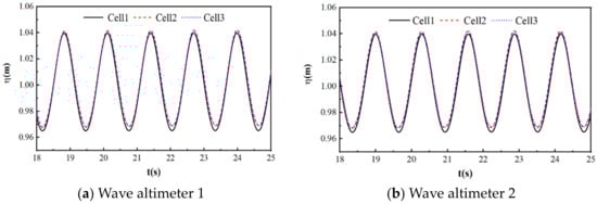 In this section, three types of meshing are used for the numerical wave flume, wave simulation is carried out under the same operating conditions, and finally, the lowest amount of mesh and an increased accuracy are obtained by comparing the simulated values. Due to the complexity of fluid changes, a more precise grid is required to capture the changes in the flow field. Therefore, this paper has set up five layers of grids around the wave situation; the closer the grid is to the free surface, the denser it is. Table 1 shows the specific dimensions of three types of grid refinement. This simulation is conducted under wave conditions of S = 0 and A = 0.05 m, with a unified time step of 0.002 s. The altimeter settings are as follows: altimeter 1 is located at 1.65 L in the working area, and altimeter 2 is located at 1.85 L.