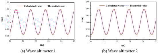 Based on the aforementioned verification, cell 2 and a time step of 0.002 s are selected for numerical wave simulation. The simulated wave is a fifth-order wave with a period of 1.29 s and a wave height of 0.075 m. The comparison between the calculated and theoretical values is depicted in Figure 5. It is evident from the figure that the simulated values closely align with the theoretical values, thus affirming the accuracy of the model.