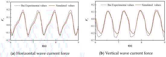 By selecting several cycles, the numerical results of the force acting on the cylinder are compared with the experimental results, as shown in Figure 6; it was found that the model has a high degree of agreement with the publicly available experimental data, proving that it exhibits good computational accuracy for calculating the wave and current forces acting on a partially submerged horizontal cylinder.